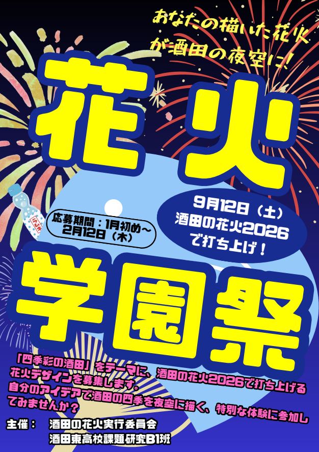 酒田の花火2026では、新たな試みとして「花火学園祭-あなたの描いた花火が酒田の夜空に-」を実施します。